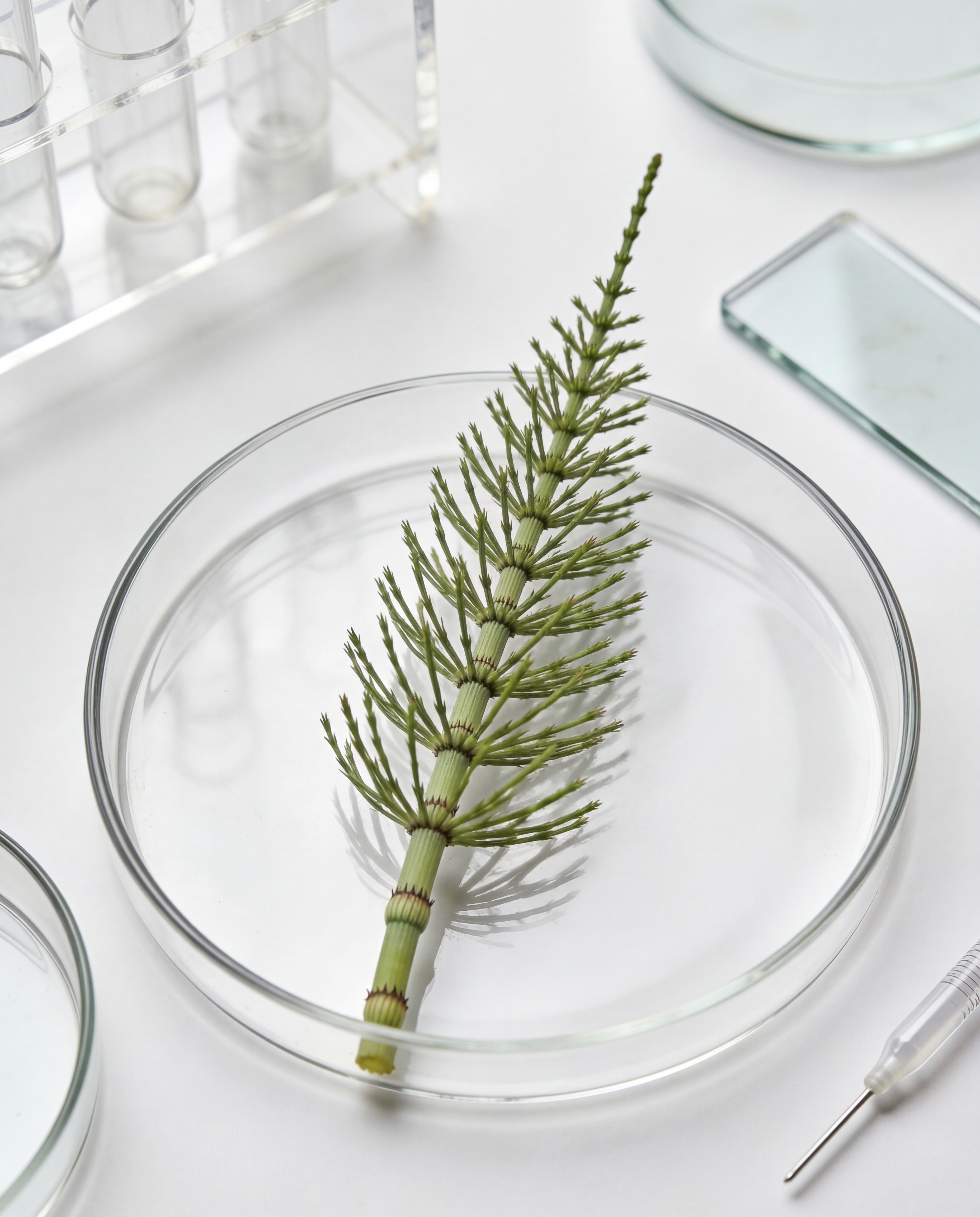 Zinnkraut (Equisetum arvense) ist eine der reichsten natürlichen Quellen für bioverfügbares Silicium. Dieses Spurenelement unterstützt die Bildung von Keratin und Kollagen, die für Struktur, Elastizität und Widerstandskraft des Haares entscheidend sind. Durch die Stärkung der Haarwurzel und die Förderung der Nährstoffversorgung der Kopfhaut kann Zinnkraut gesundes Haarwachstum unterstützen und Haarverlust vorbeugen.